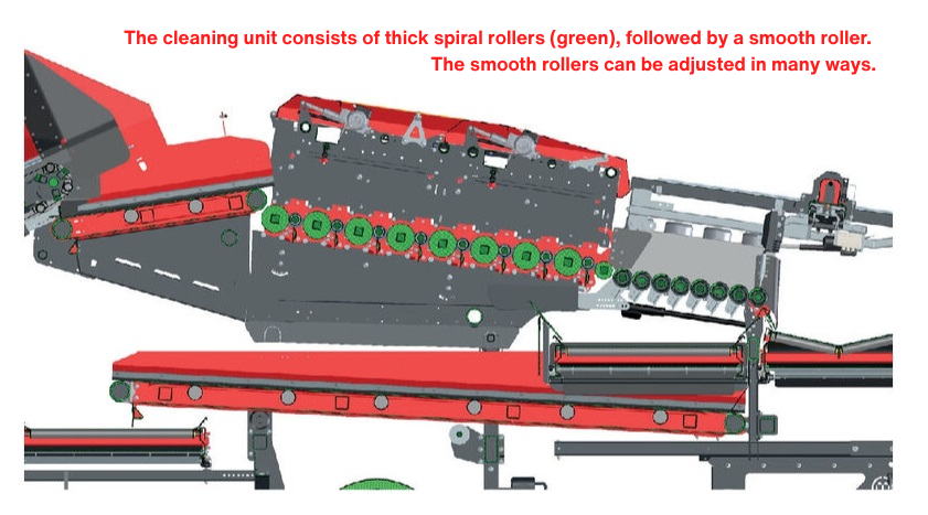 Im abwärts geneigten Grundrahmen der Reinigungsmodul-Komponente folgt auf eine dicke Spiralrolle eine glatte rolle. Sowohl die Spiral‑ (mit Rippen) als auch die glatten Rollen werden von Elektromotoren angetrieben: die Spiralrollen auf einer Seite der Maschine, die glatten Rollen auf der anderen Seite. Der Vorteil von Elektromotoren ist, dass die Drehzahl gut geregelt werden kann und ihre Leistung wirksam gegen Überlast geschützt werden kann.
