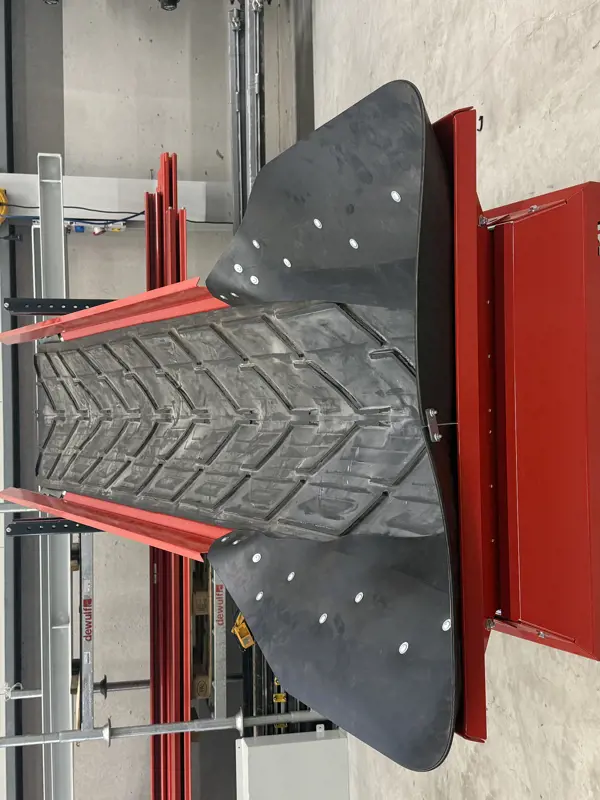 De rubberen transportband in trogvorm met 17 mm hoog chevronprofiel garandeert een stabiel en productvriendelijk transport richting de kistenvuller.